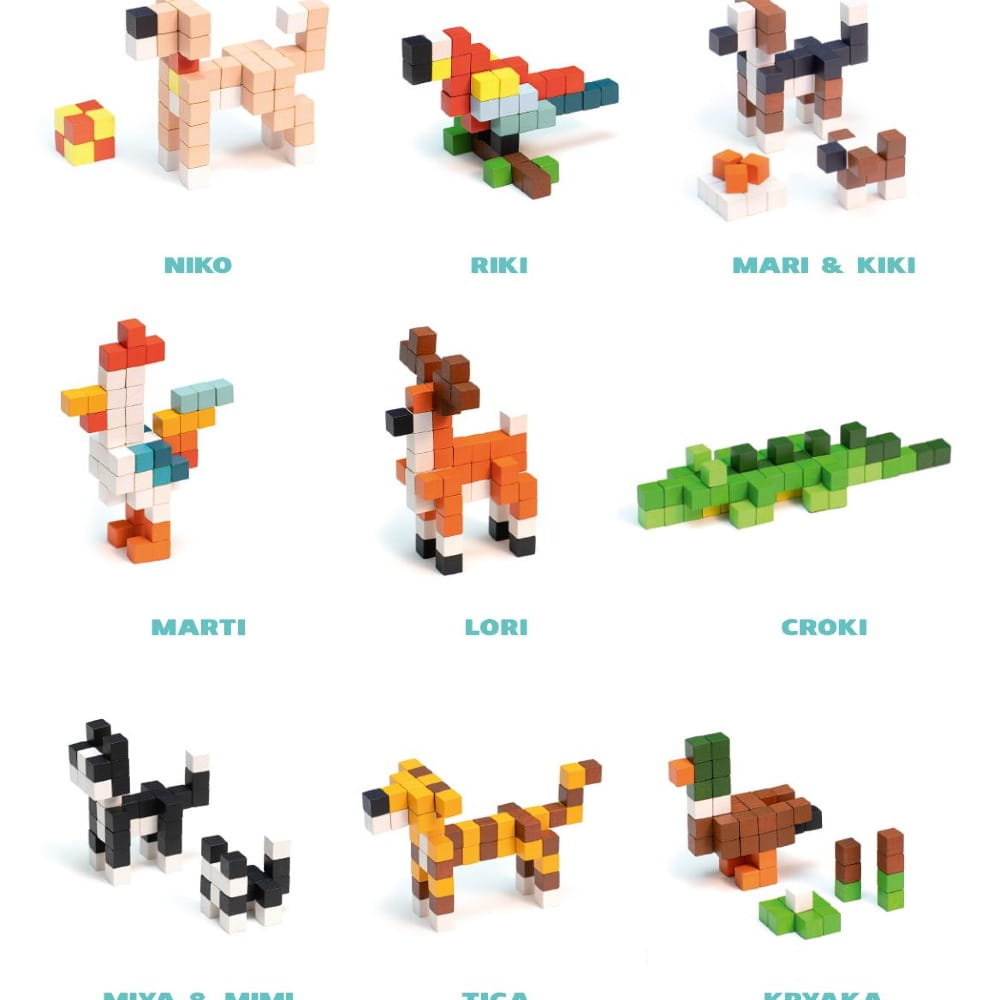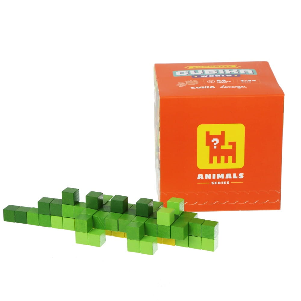 W zestawie 1 z 9 zwierząt, które należy samodzielnie złożyć z drewnianych, pikselowych kostek przy pomocy instrukcji i dwustronnej taśmy załączonej do zestawu.