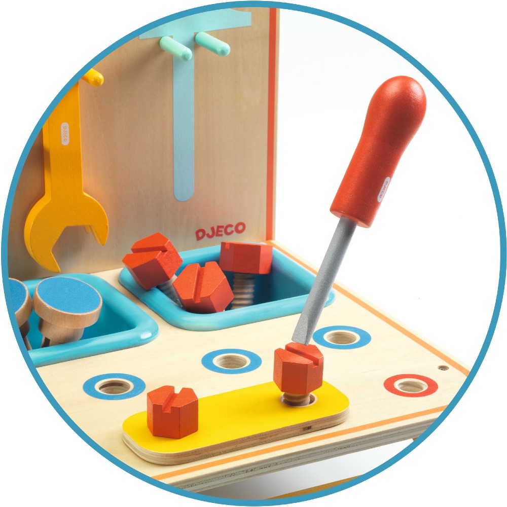 Drewniany stół majsterkowicza Djeco to doskonała zabawka do: