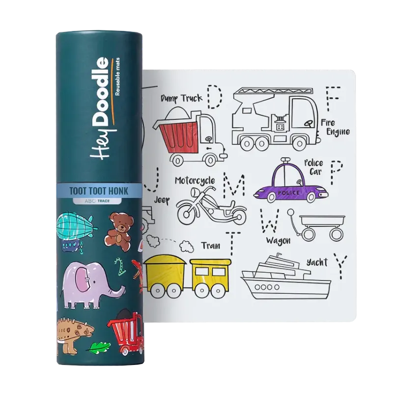 Mata silikonowa HeyDoodle „Toot Toot Honk” łączy świat pojazdów z nauką liter i pierwszych słów po angielsku.