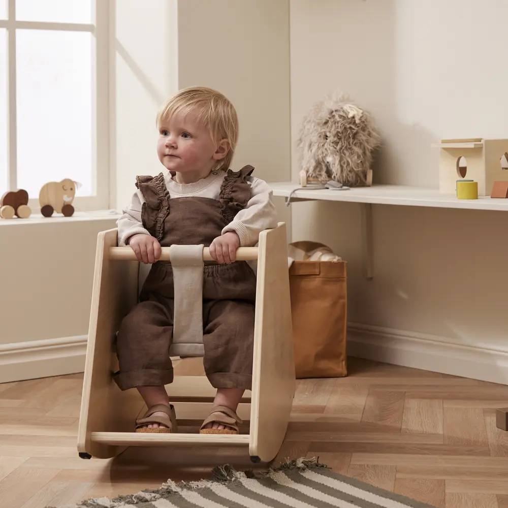 To drewniany bujak zaprojektowany w duchu skandynawskiego minimalizmu. Nie dominuje wizualnie wnętrza, wygląda elegancko i bardziej nowocześnie niż klasyczne koniki na biegunach.