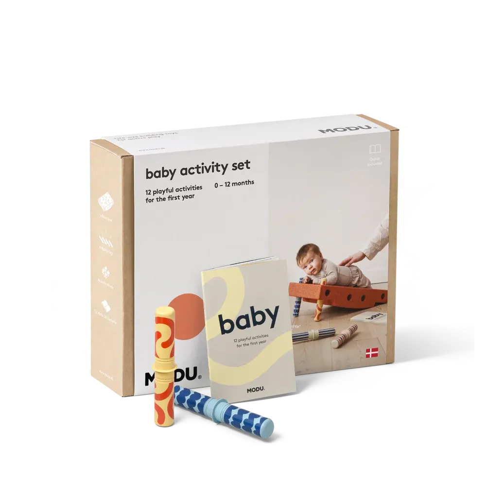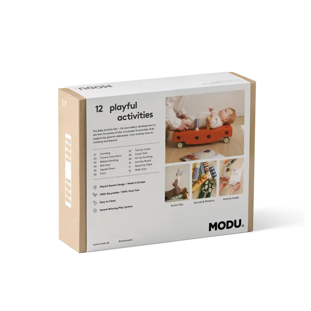 MODU Baby Activity Set to przemyślany zestaw stworzony we współpracy z terapeutami, który pomaga dziecku rozwijać się od pierwszych tygodni aż do nauki raczkowania i wstawania.