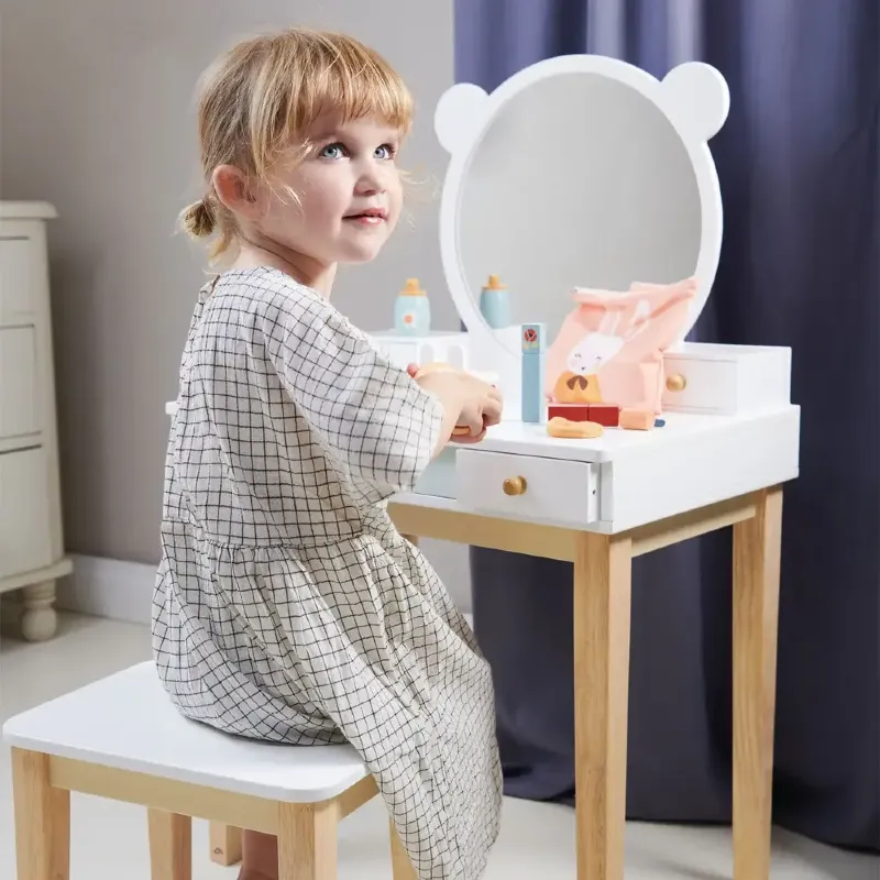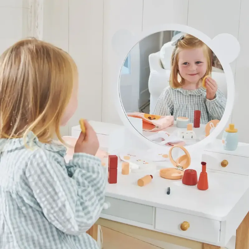 Drewniana toaletka ze stołkiem Tender Leaf Toys to doskonały prezent dla 3-latki i starszych dzieci, które uwielbiają bawić się w naśladowanie dorosłych i tworzyć swoje rytuały piękna.
